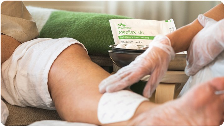 Mepilex Up is intended for a wide range of acute and hard-to-heal wounds with low to high wound fluid such as leg and foot ulcers, pressure injuries and traumatic wounds.